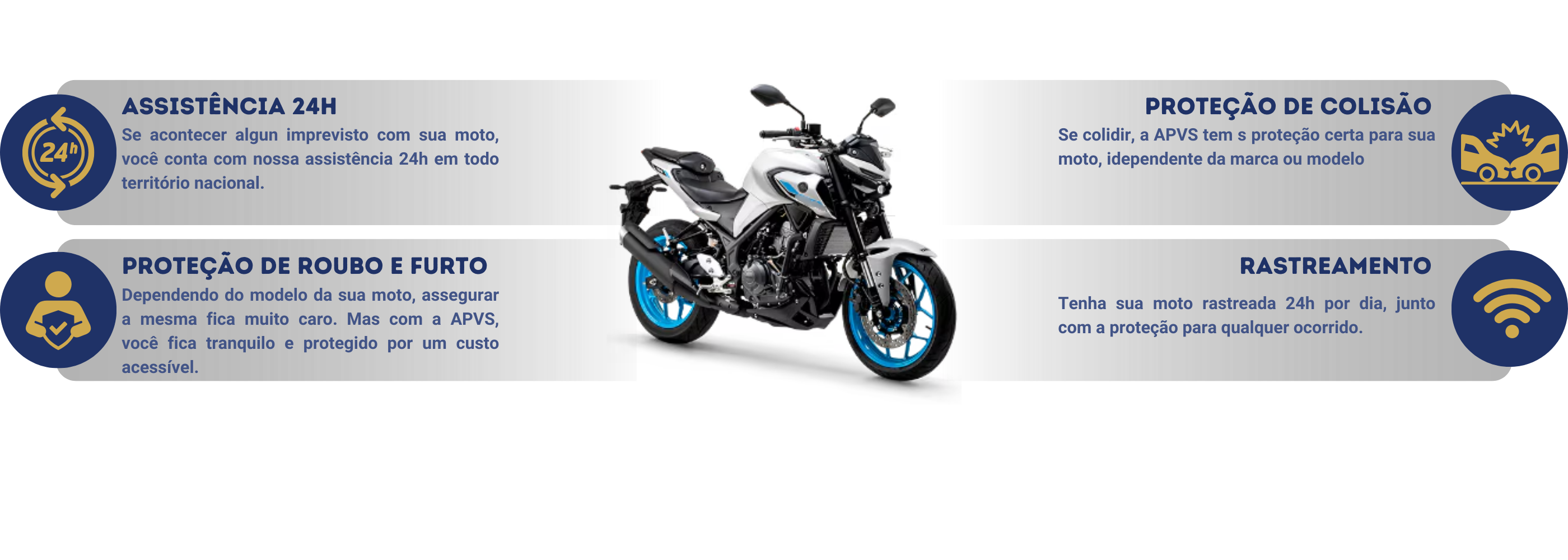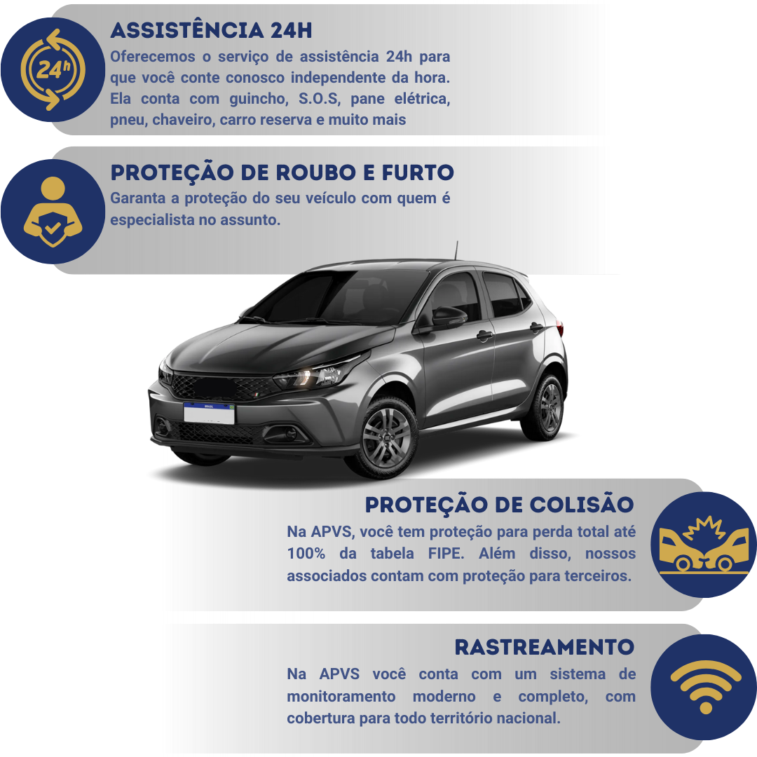 Com APVS seu veículo estará protegido contra os principais riscos e imprevistos que podem acontecer no dia a dia, como Roubo e Furto, Danos Parciais e Perda Total, Danos a Terceiros, Incêndio, Fenômenos da Natureza, Vidros e Carro Reserva.
