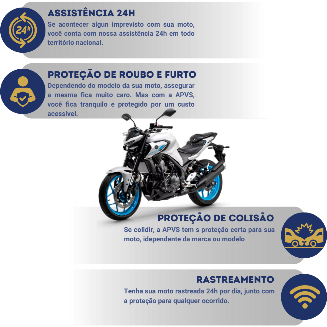 Com APVS seu veículo estará protegido contra os principais riscos e imprevistos que podem acontecer no dia a dia, como Roubo e Furto, Danos Parciais e Perda Total, Danos a Terceiros, Incêndio, Fenômenos da Natureza, Vidros, Carro Reserva e diversos outros.